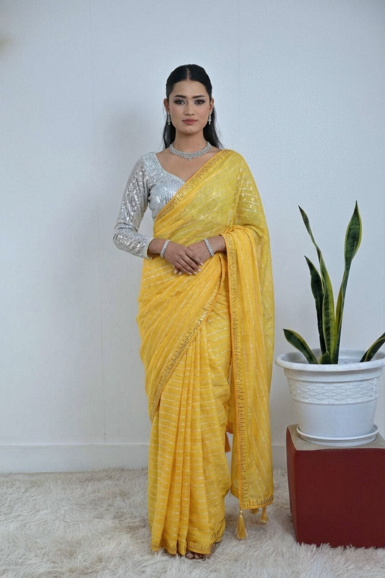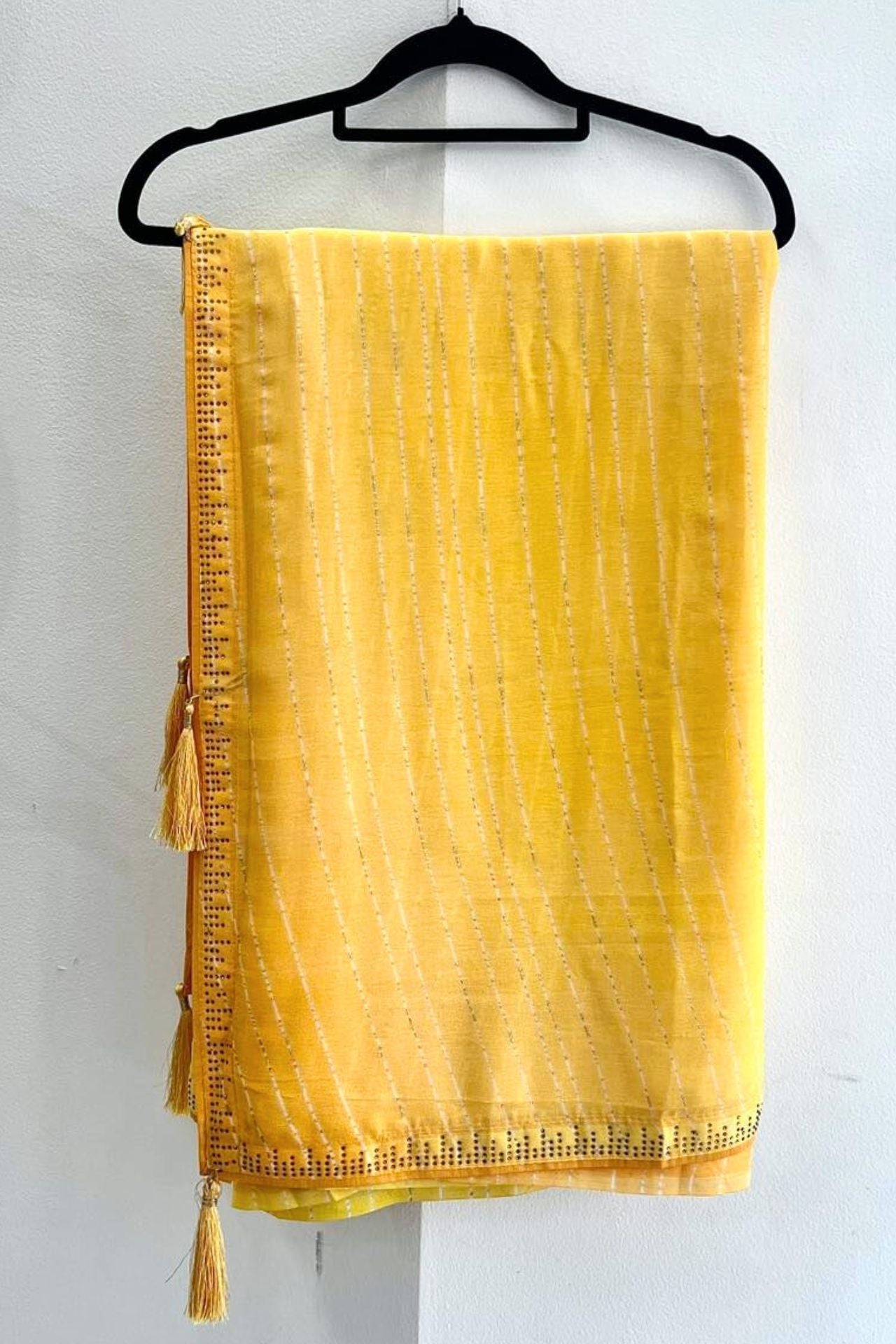Yellow Georgette Saree Striped Sequin Border