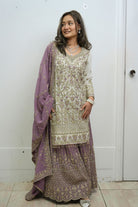 Design: Heavily embroidered short Kurta and flared, tiered Sharara bottom with tassels, paired with a fully embroidered dupatta.