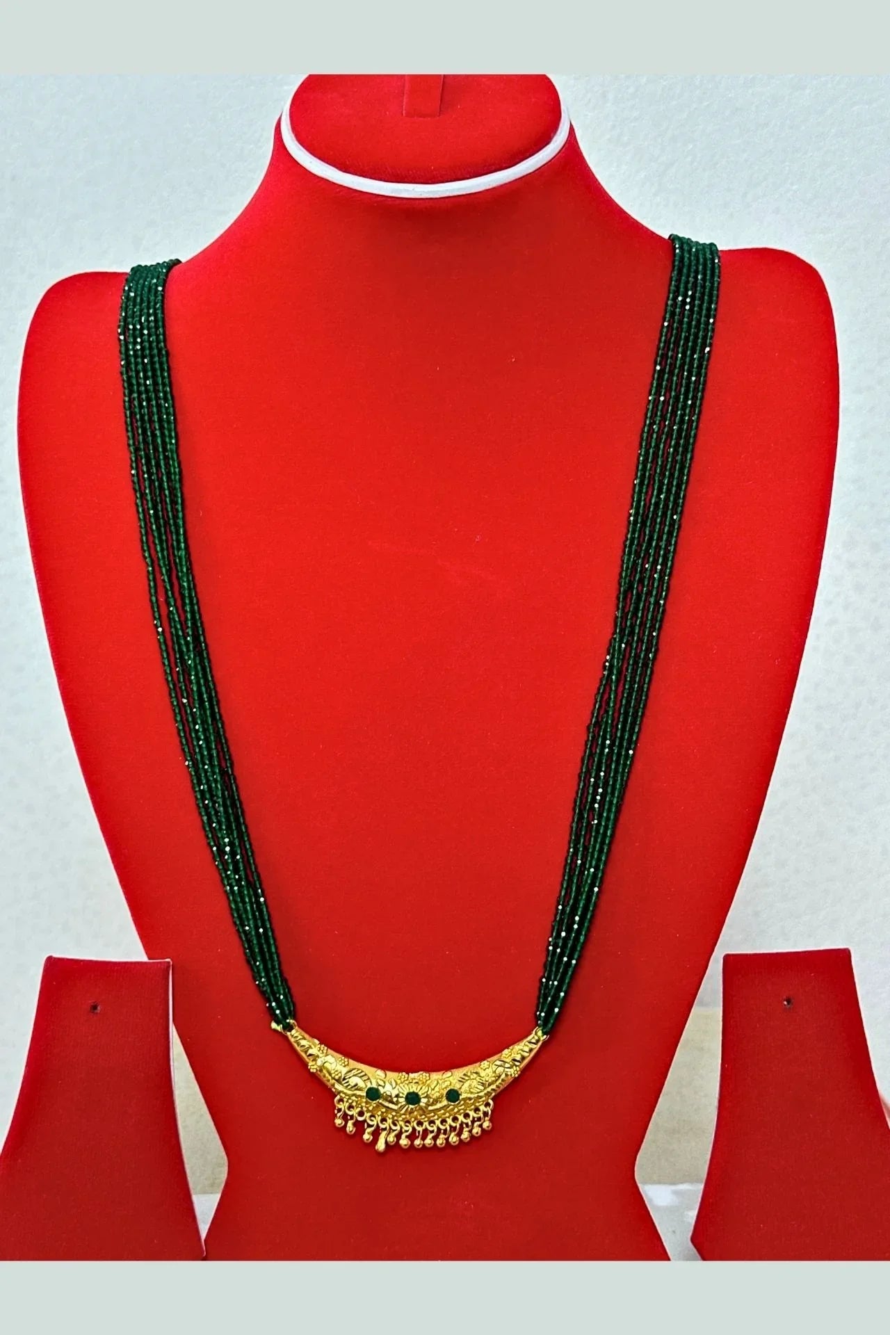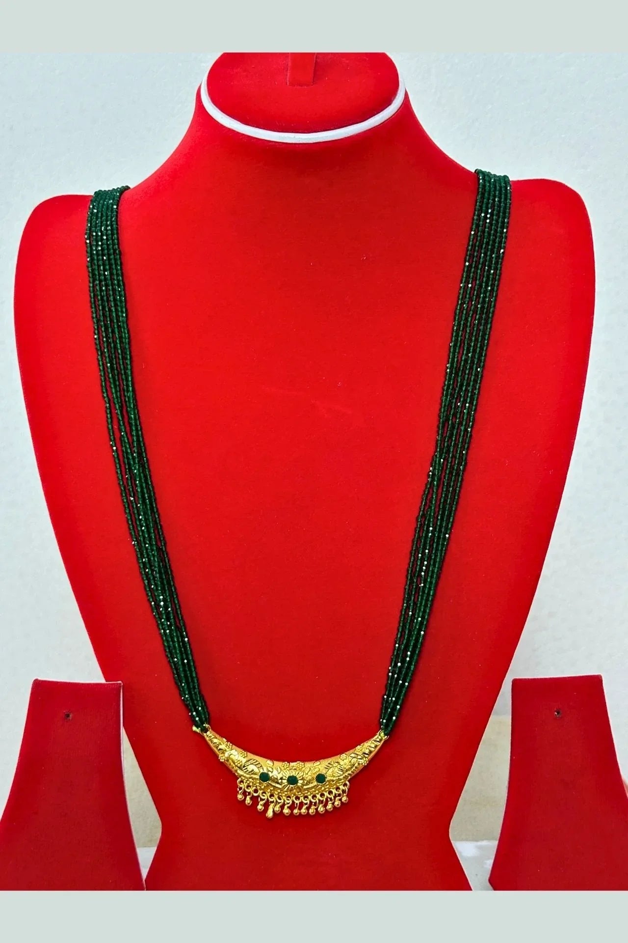- Pendant: A statement gold-toned pendant with an ornate, curved design, likely depicting traditional motifs. It is finished with a series of small, suspended gold charms.