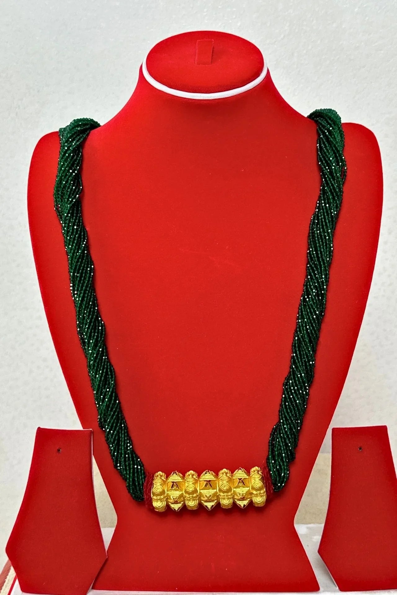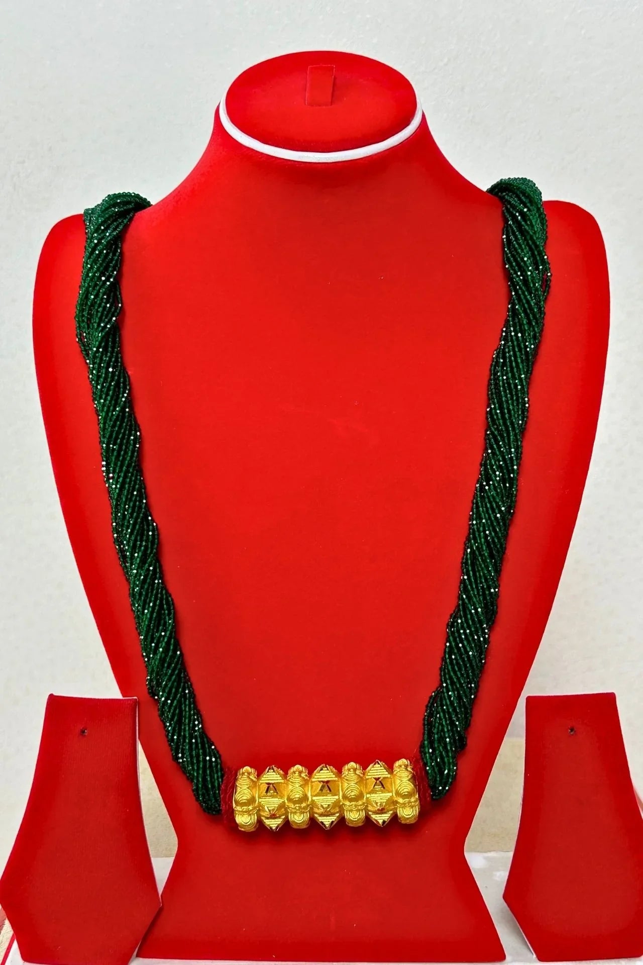- Material: High-quality alloy with a gold-plated finish; multi-strand dark green beaded chain.