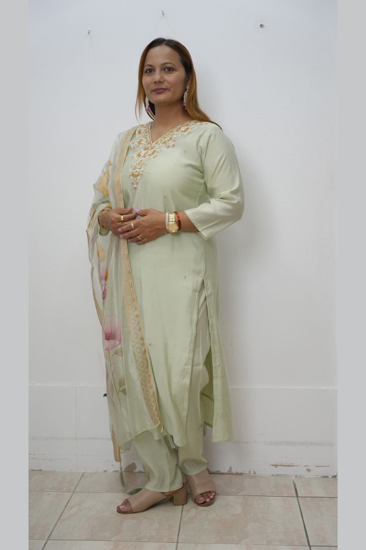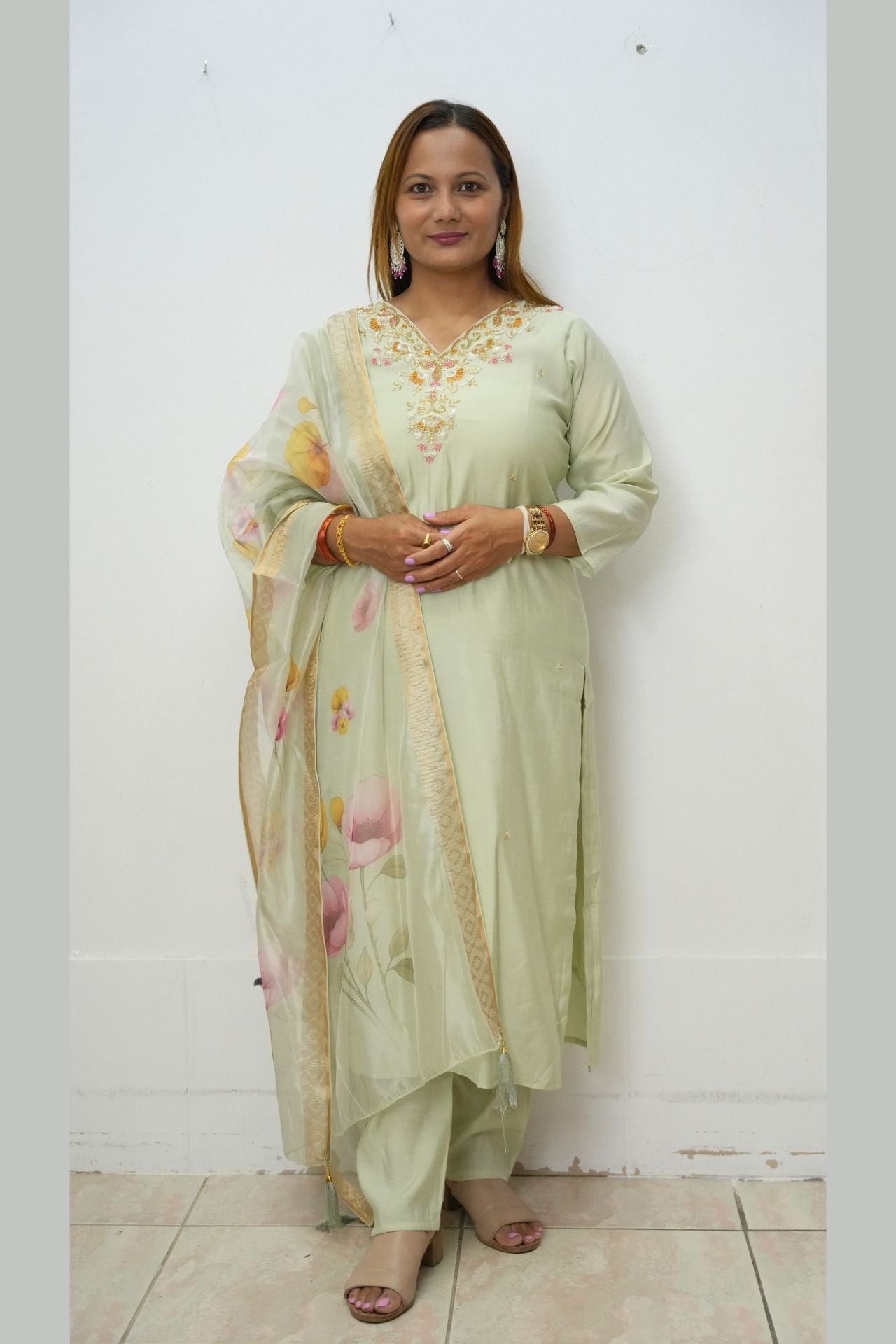 - Material/Work: Smooth Silk or Cotton Blend Kurta; Dupatta is sheer Organza with delicate Hand-Painted or Digital Floral Print and subtle thread/beadwork on the neckline