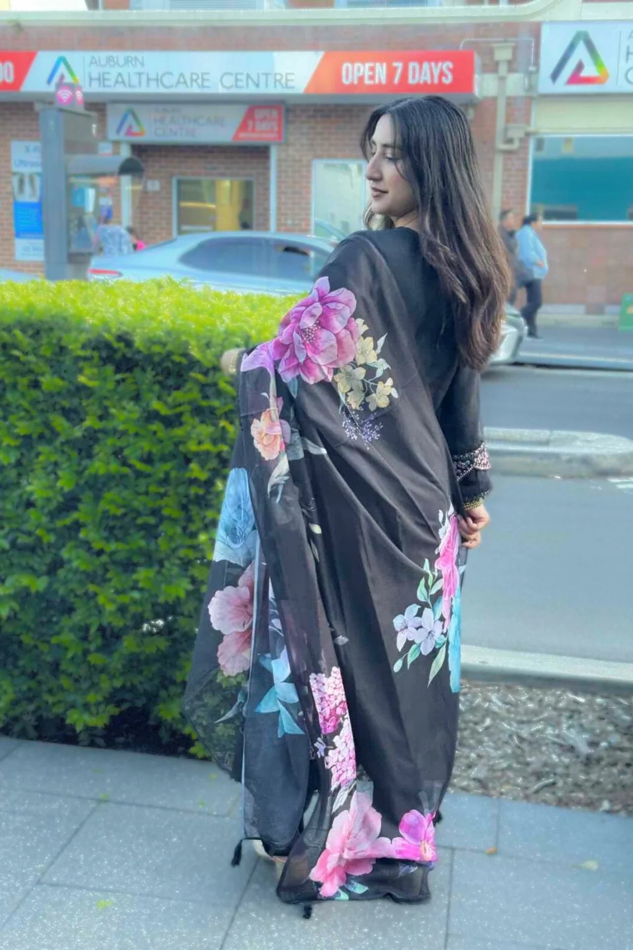 - Highlights : Colorful Thread Embroidery (pink, blue, green, white) intricately detailed around the neckline, cuffs, and bottom hem. The standout feature is the Black Sheer Dupatta covered in large, brilliant digital floral prints (purples, pinks, blues) that provide high-contrast artistry.