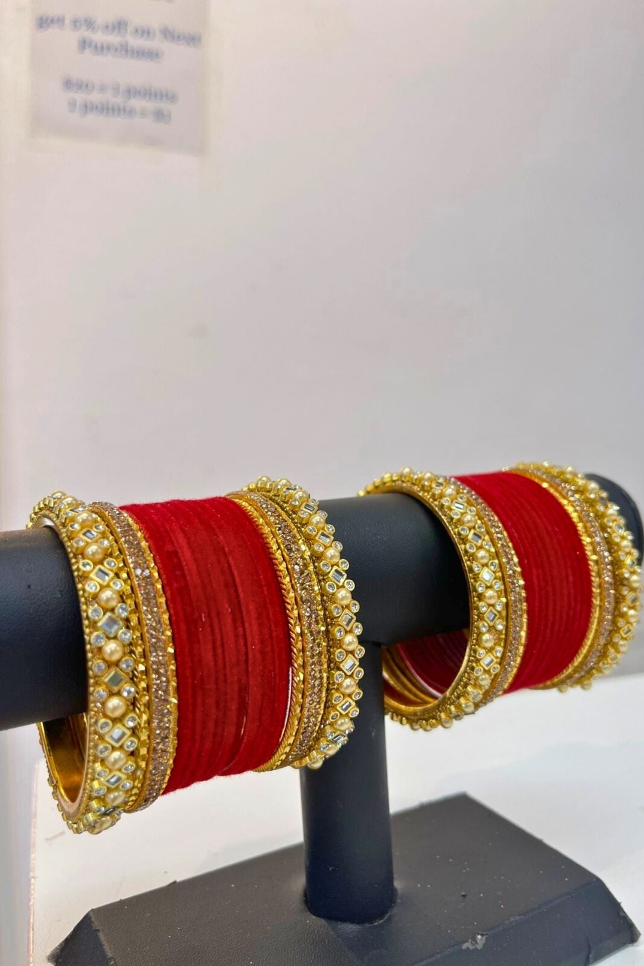Design: Combination of smooth velvet bangles and heavily detailed kadas featuring pearls, stones, and mirrors.