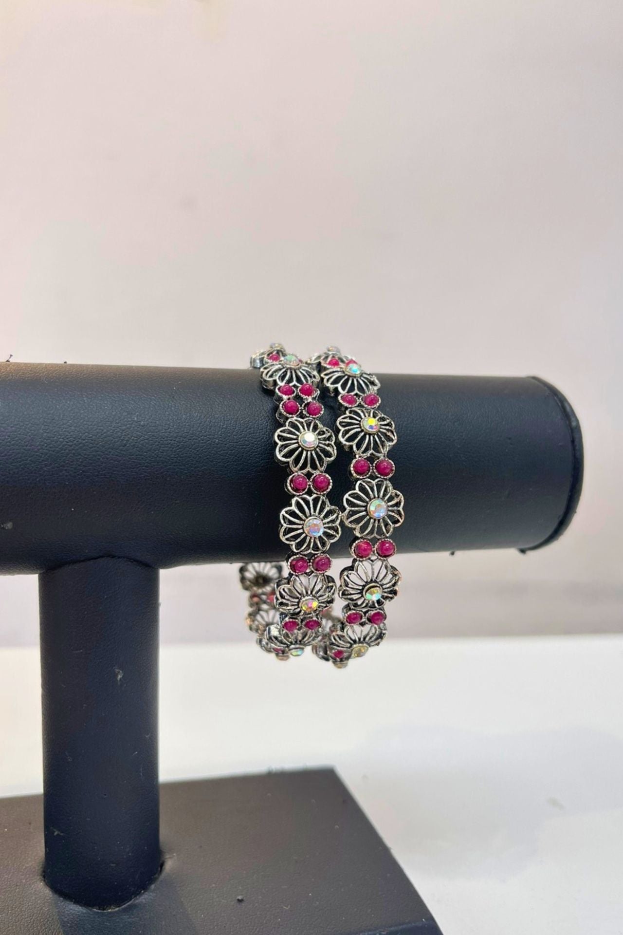 Silver Floral Bangle Set With Ruby Stone Oxidized