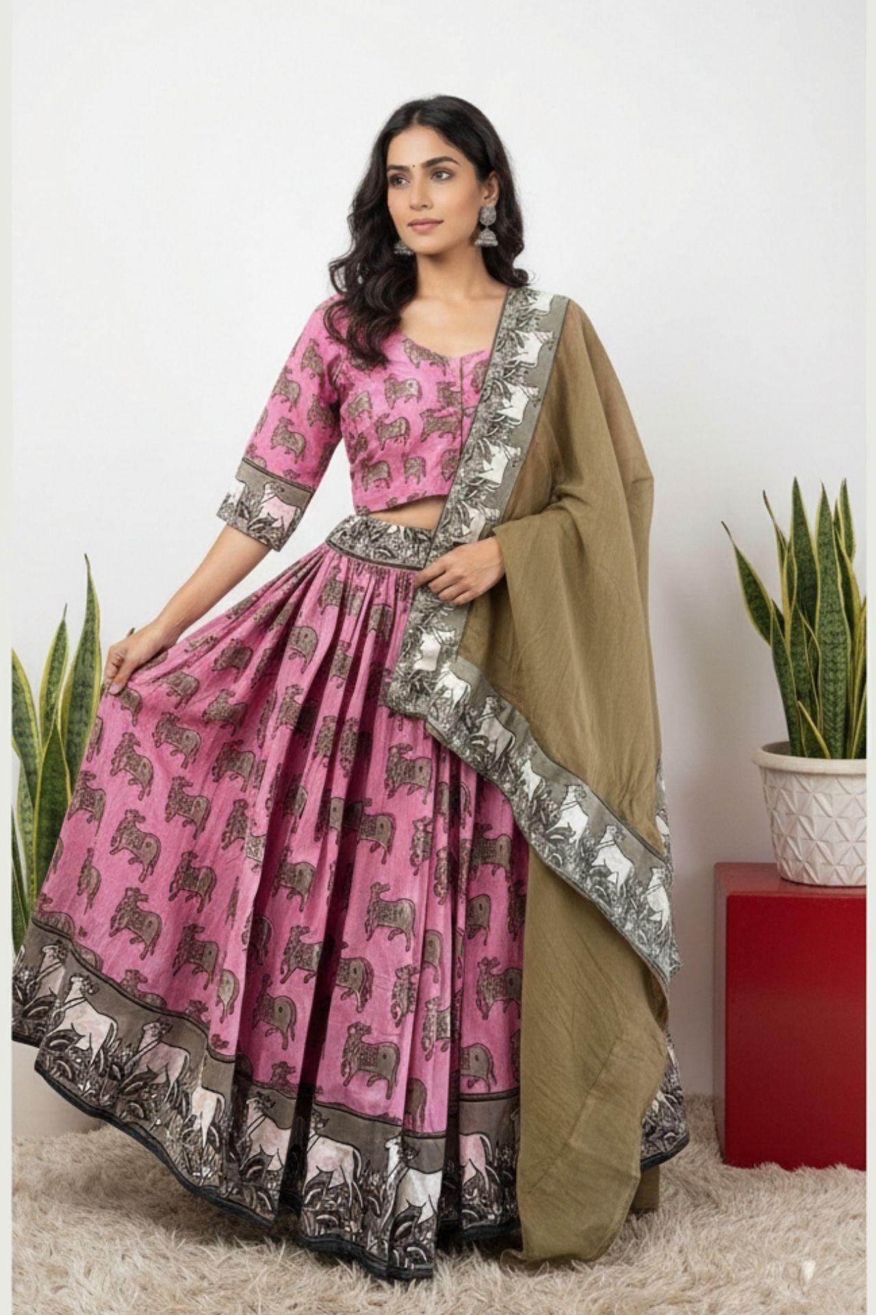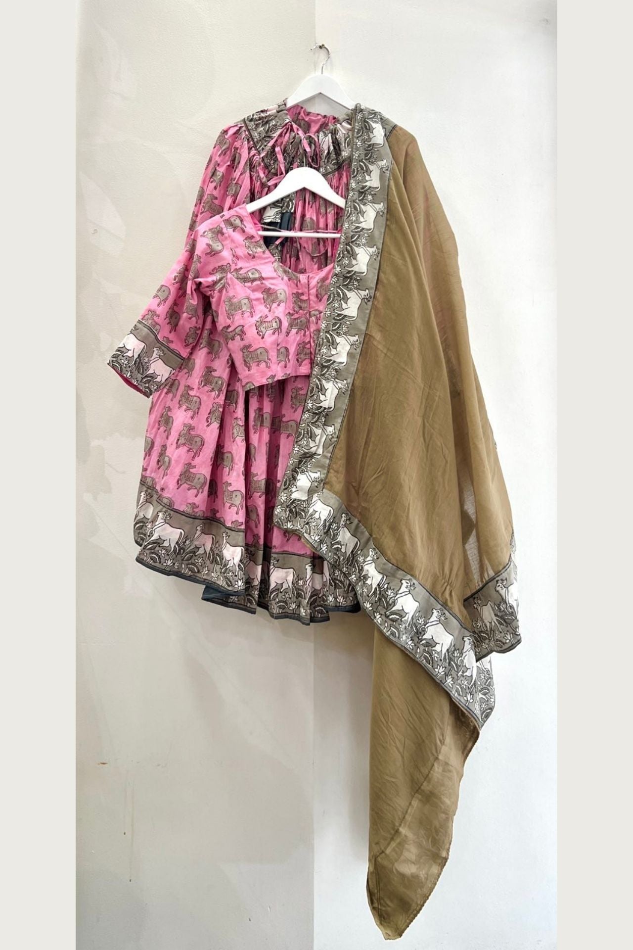 Color: Soft Pink with Brown Animal Print; Brown Dupatta