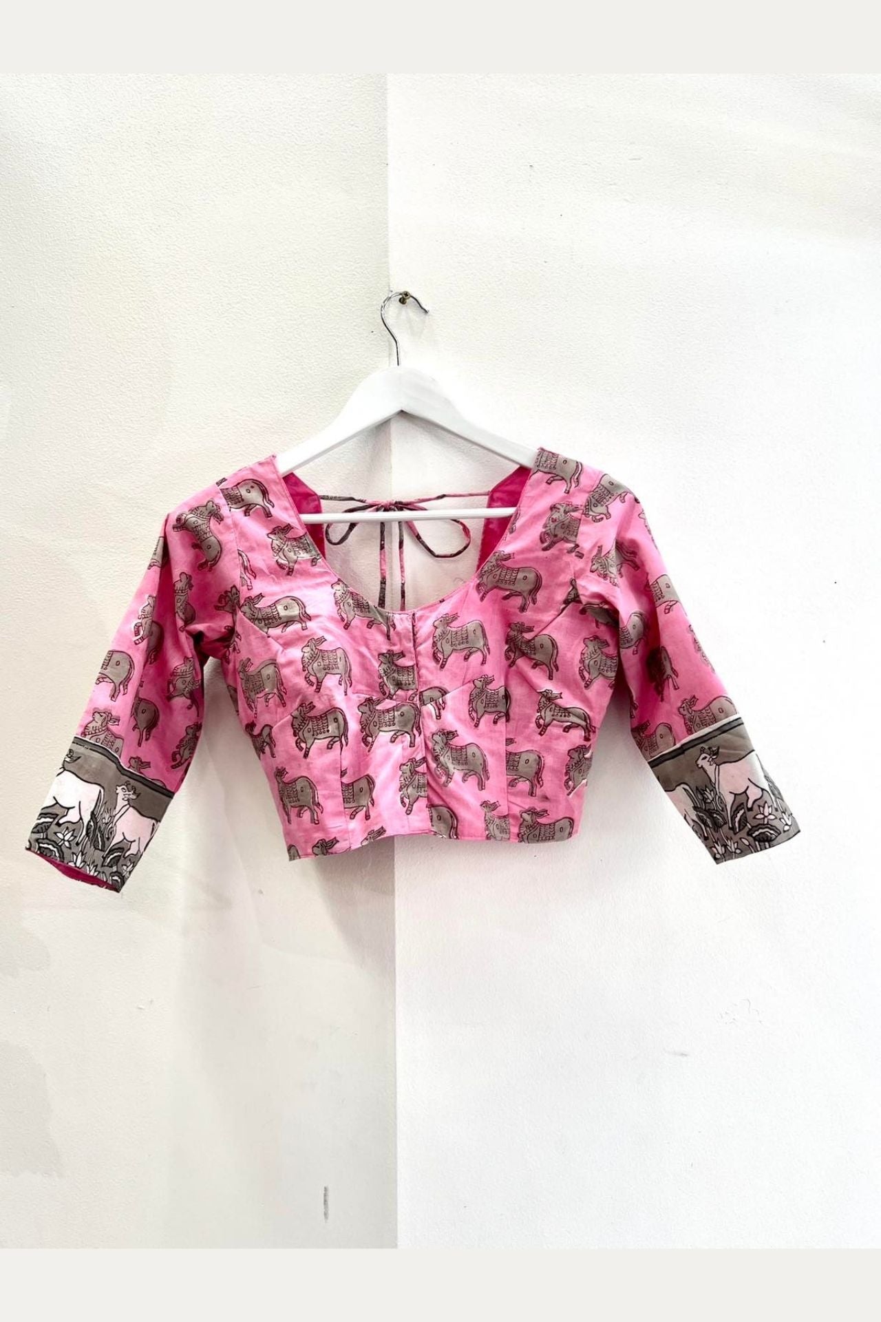 Design: Traditional block-style animal and figure print; contrast dark border; plain dupatta.