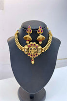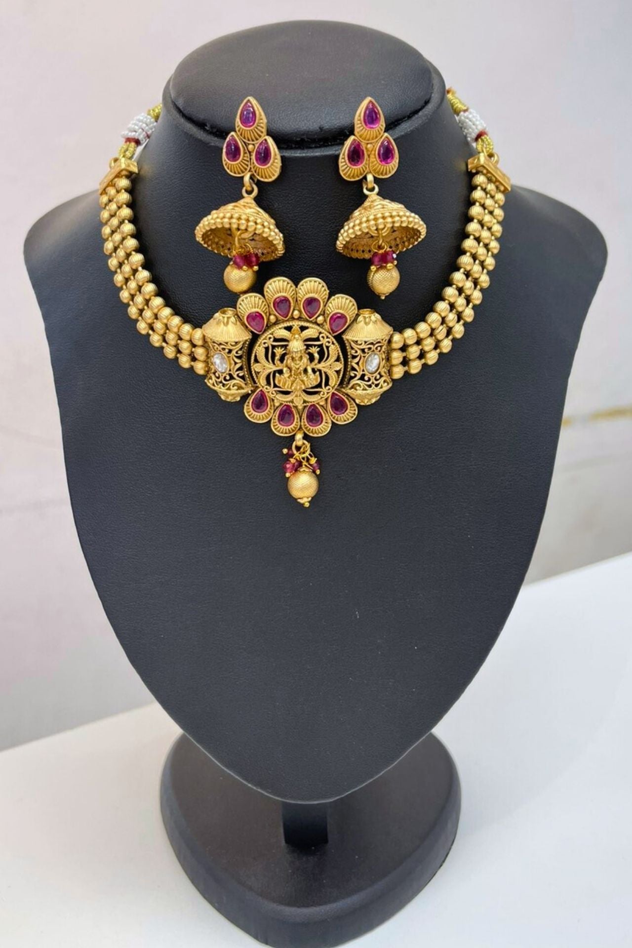 Design: Features a triple-layered golden bead chain leading to a central temple-style medallion with a Goddess motif, surrounded by floral stone-encrusted petals.