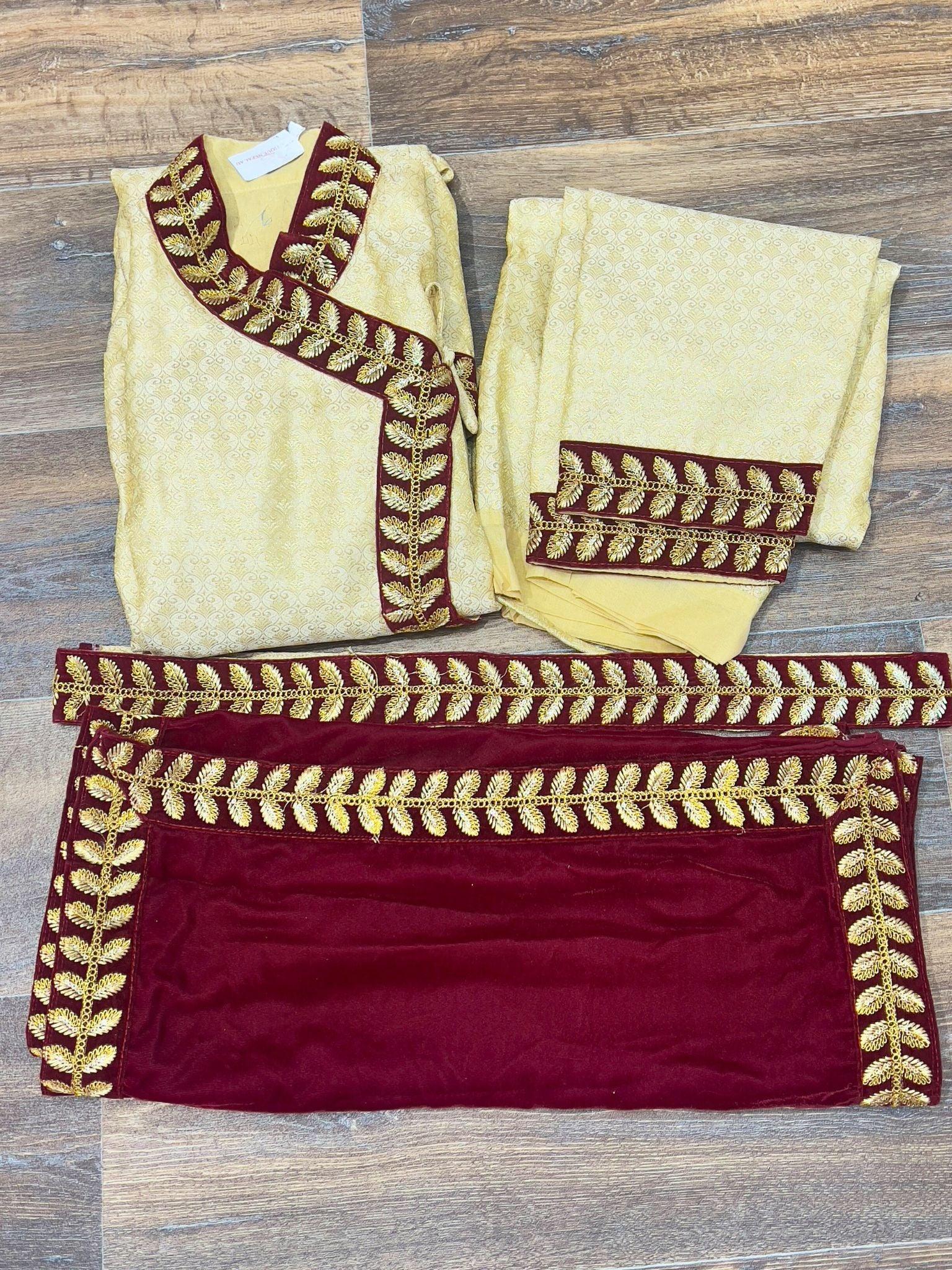 Daura Set embroidery details on ivory silk come with red makhmal dupatta, Suruwal, Shoes, Belt, and the topi.