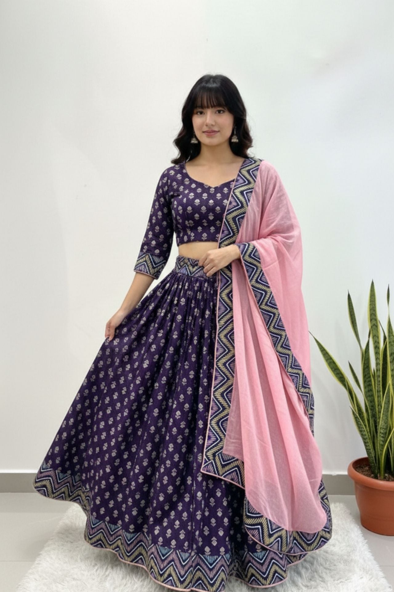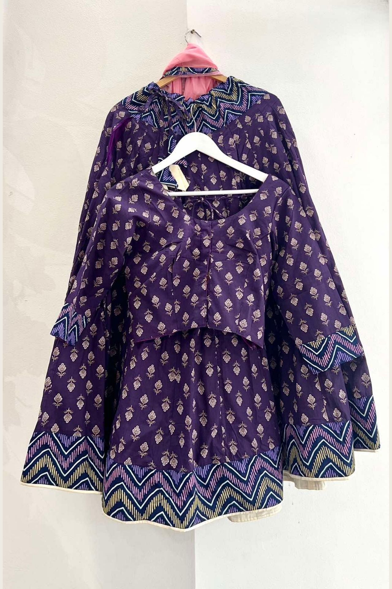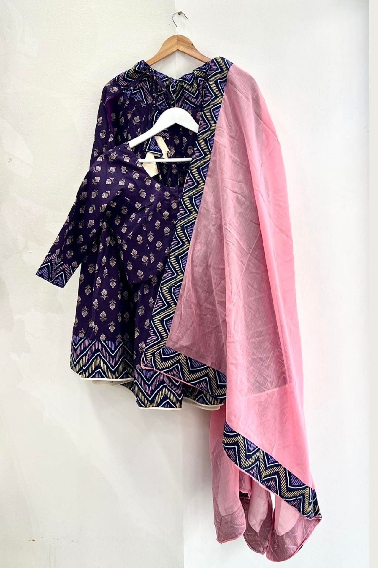 • Color: Deep Purple with Gold Print; Hot Pink Contrast Dupatta